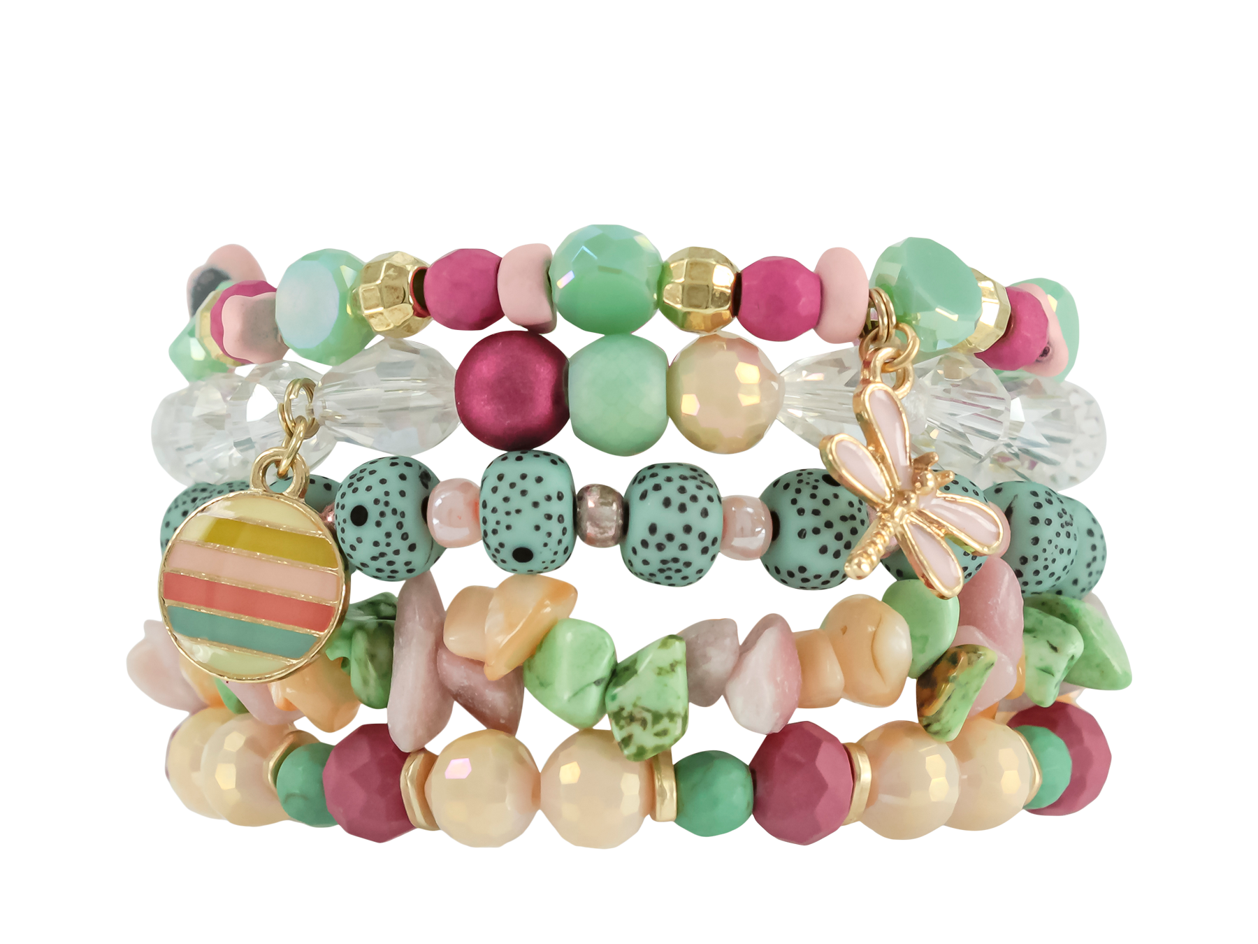 - This stack features a gorgeous combination of mint and pink colored beads.